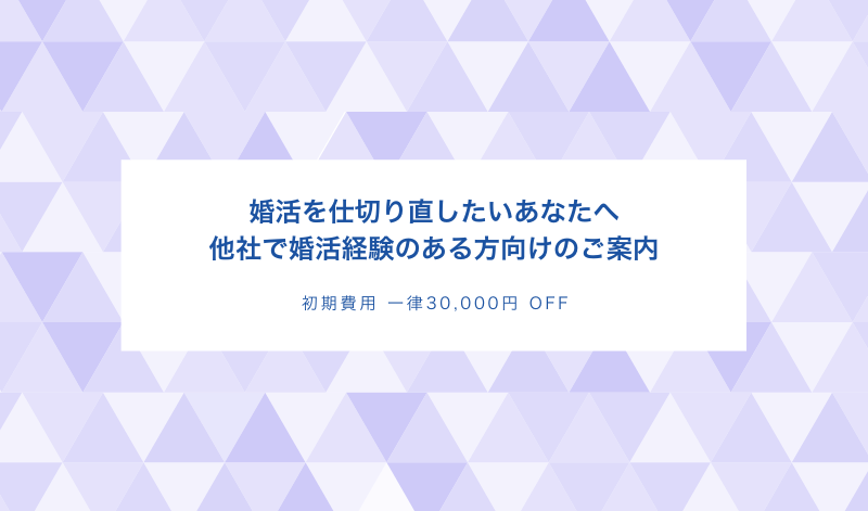 他社ご活動経験者限定初期費用30,000円OFF過去1年以内に他社結婚相談所でご活動された方